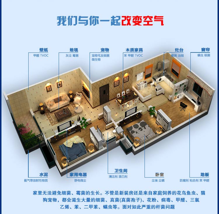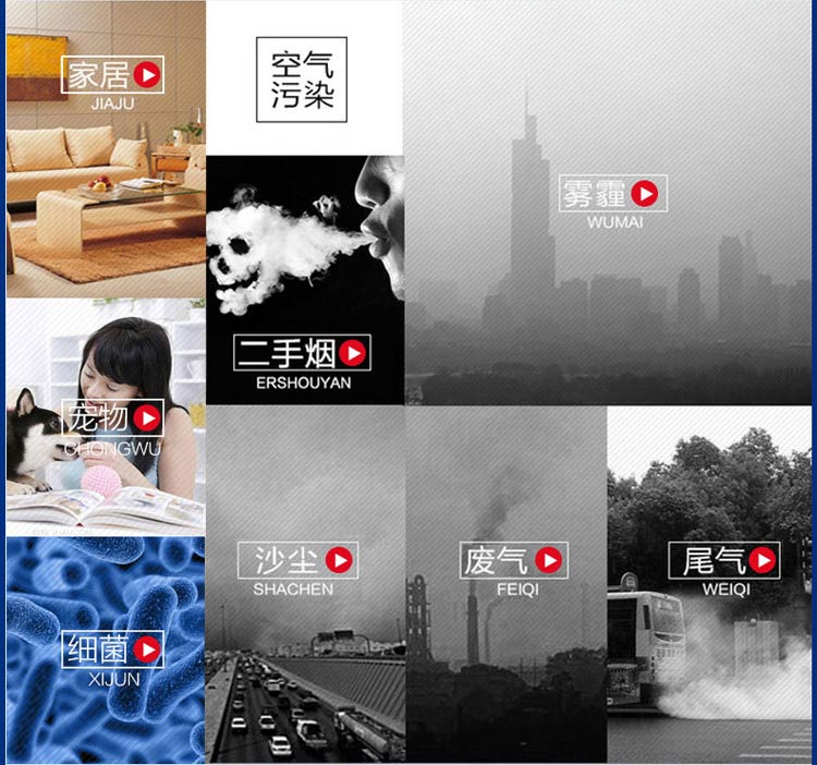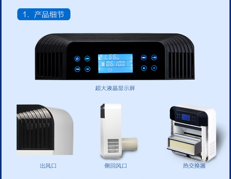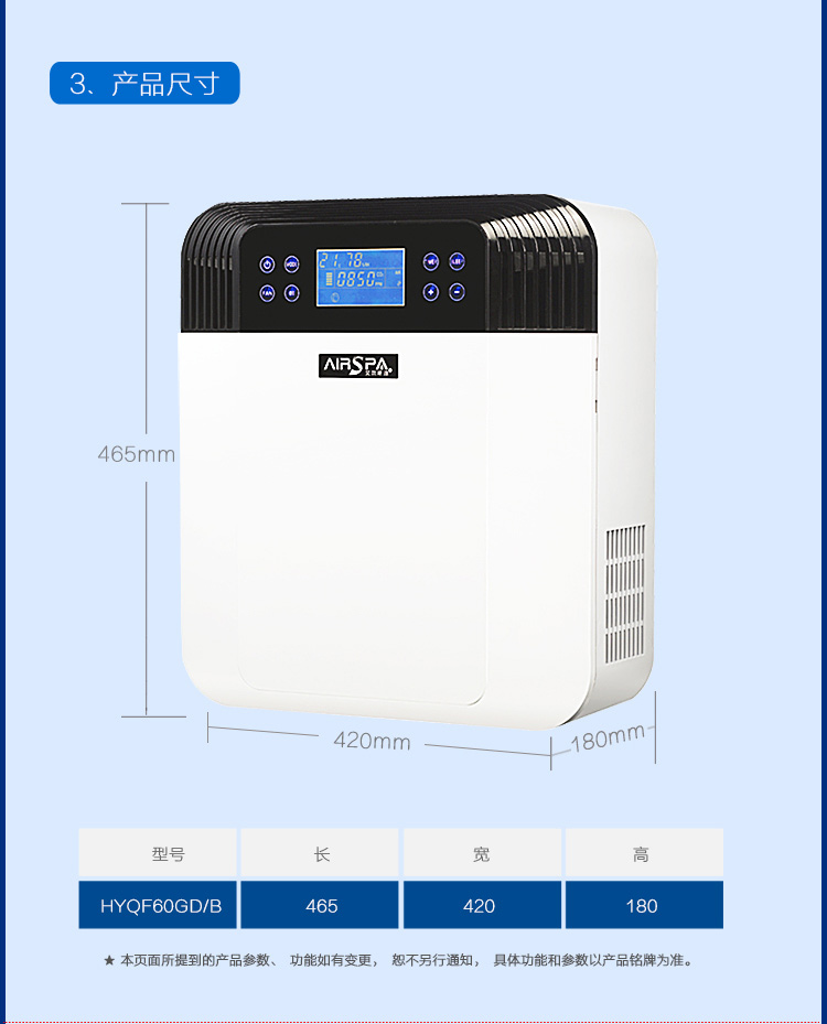 2、超大液晶顯示,自動顯示功能模式,風量大小,室內溫度,濕度,空氣質量